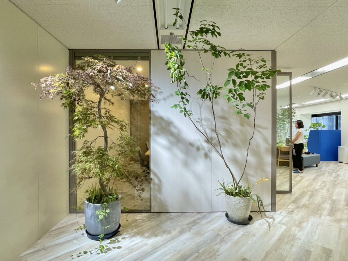 素材に頼らず、光・空気・植栽・動線のデザインによって“いごこち”をつくり出し、来客対応と執務が両立するワークスペースへと生まれ変わりました。