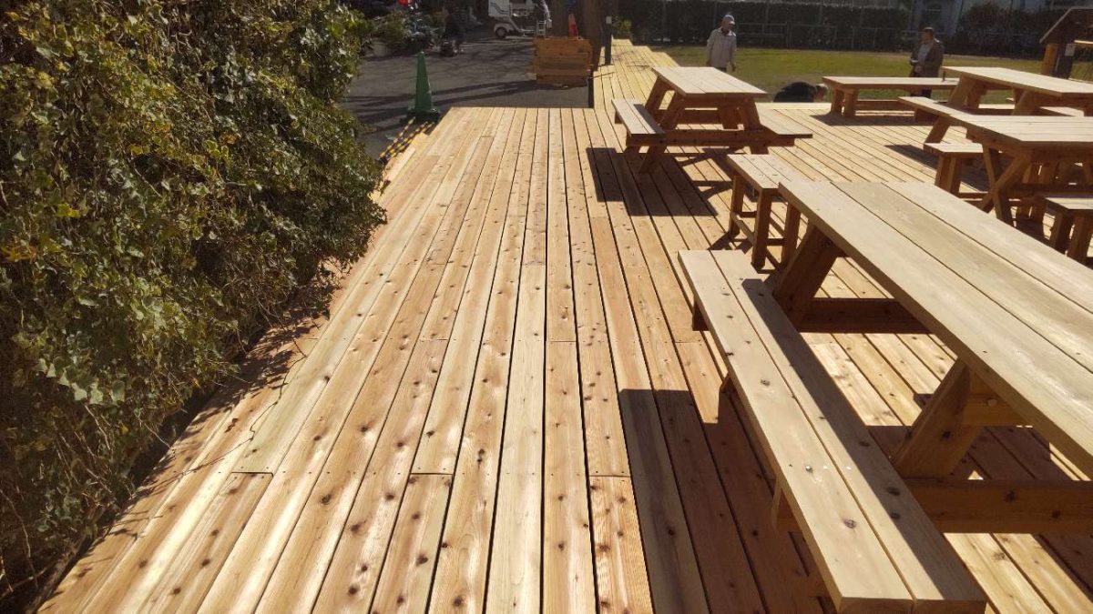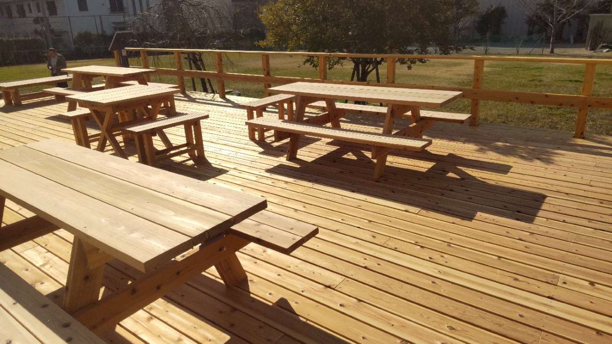 デッキ上には、複数のテーブルとベンチをゆったりと配置。